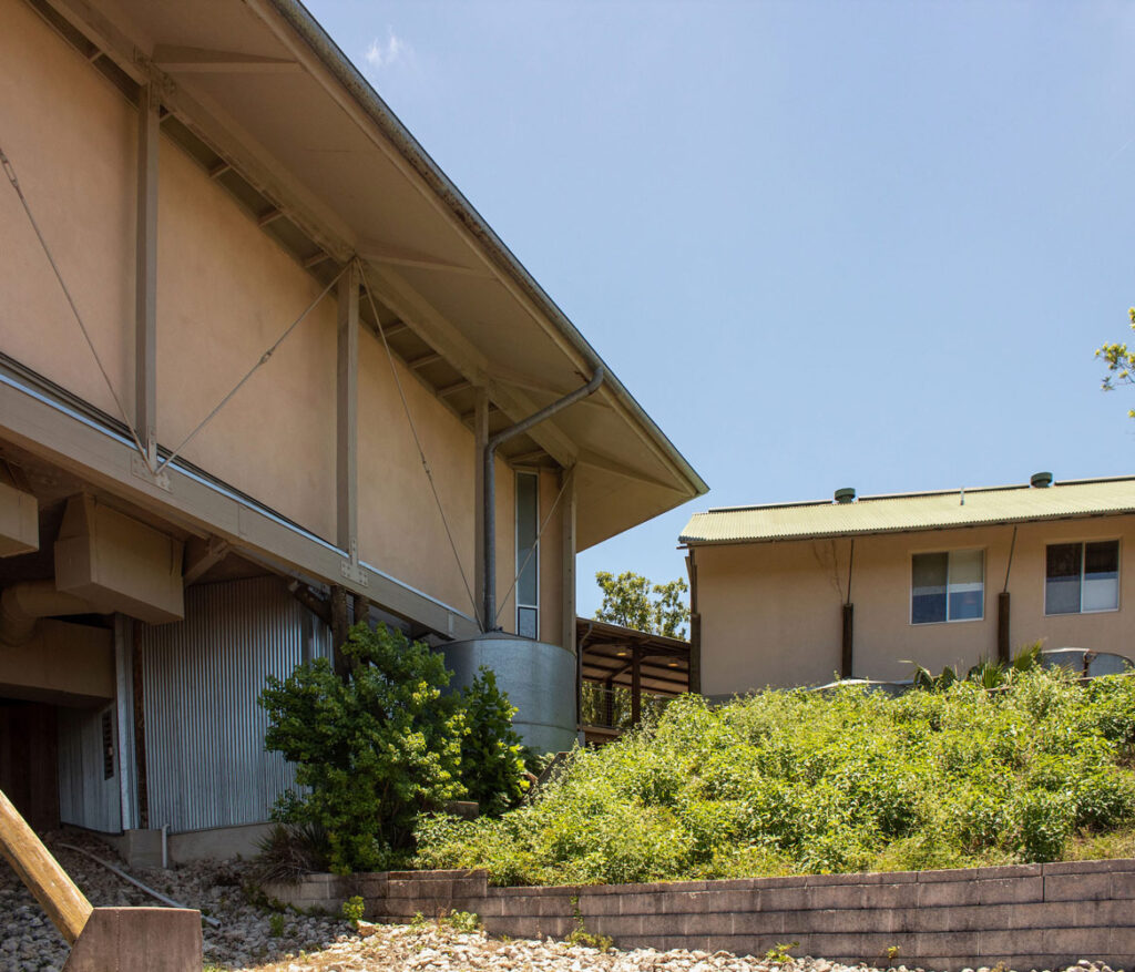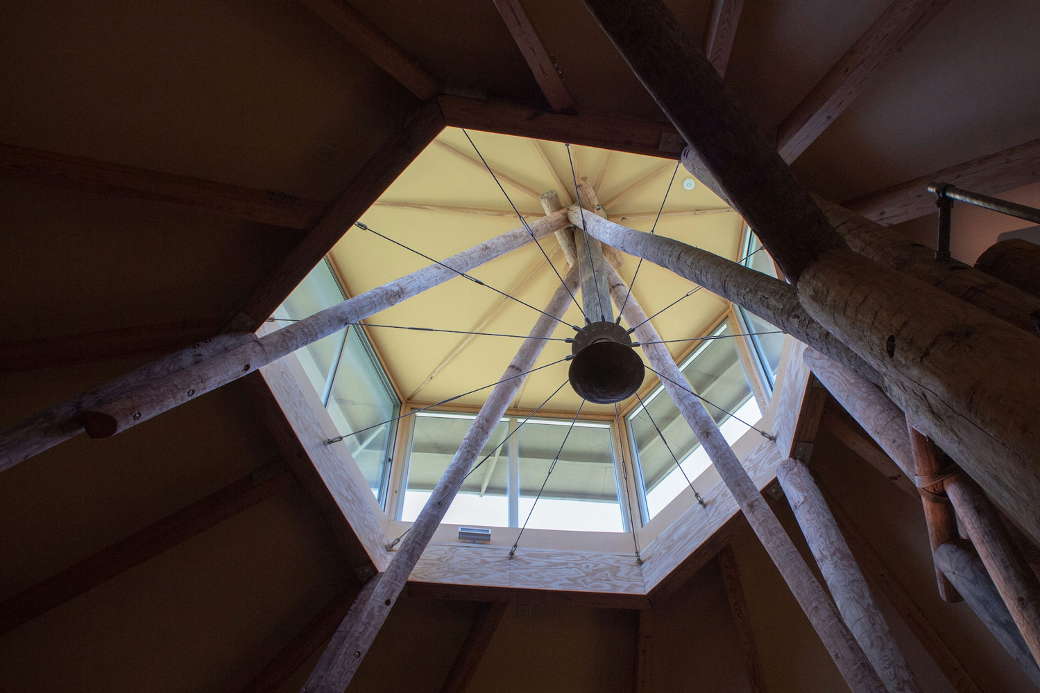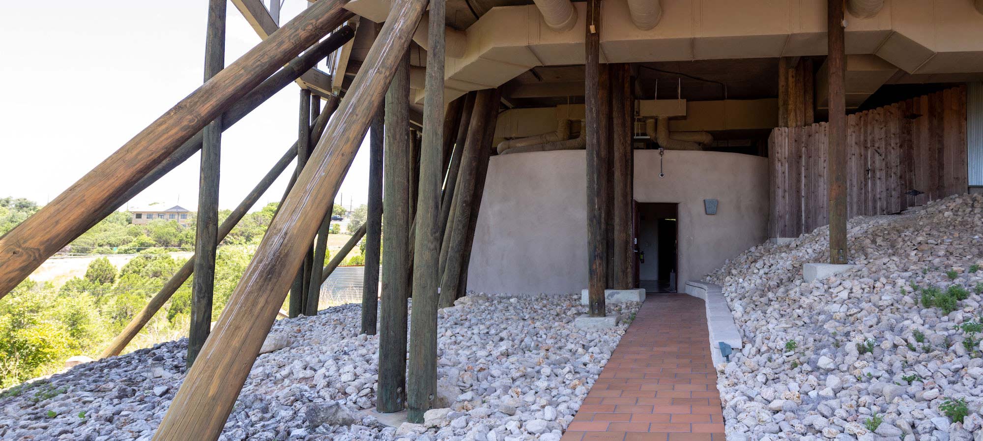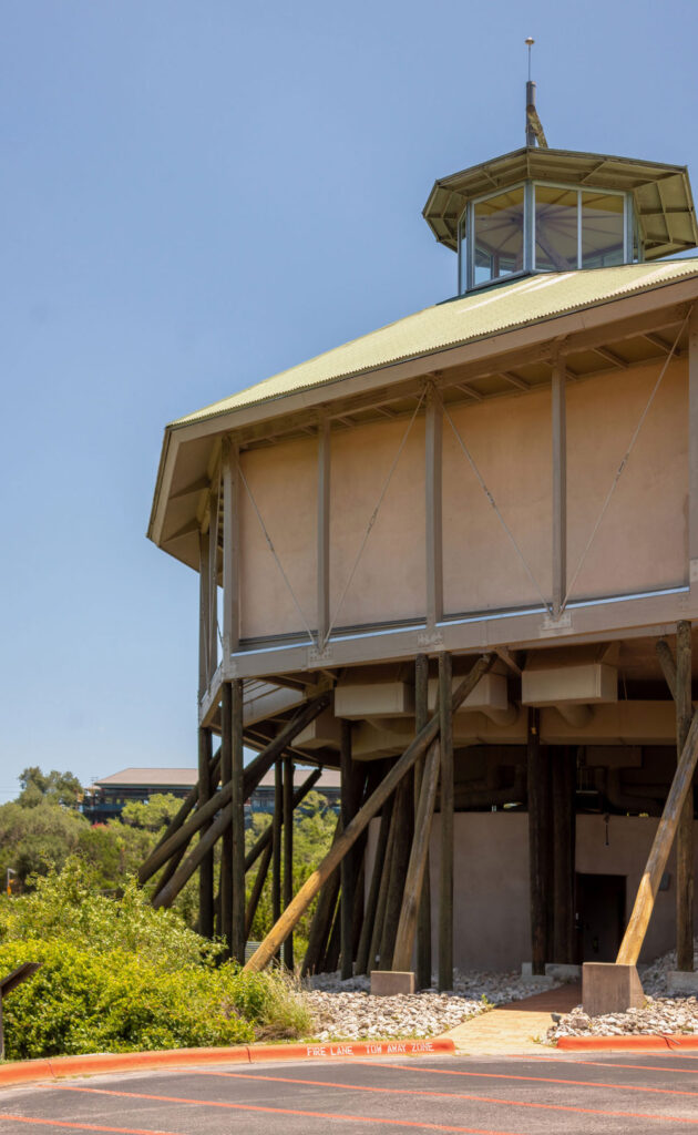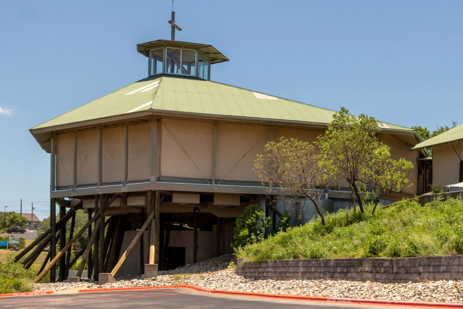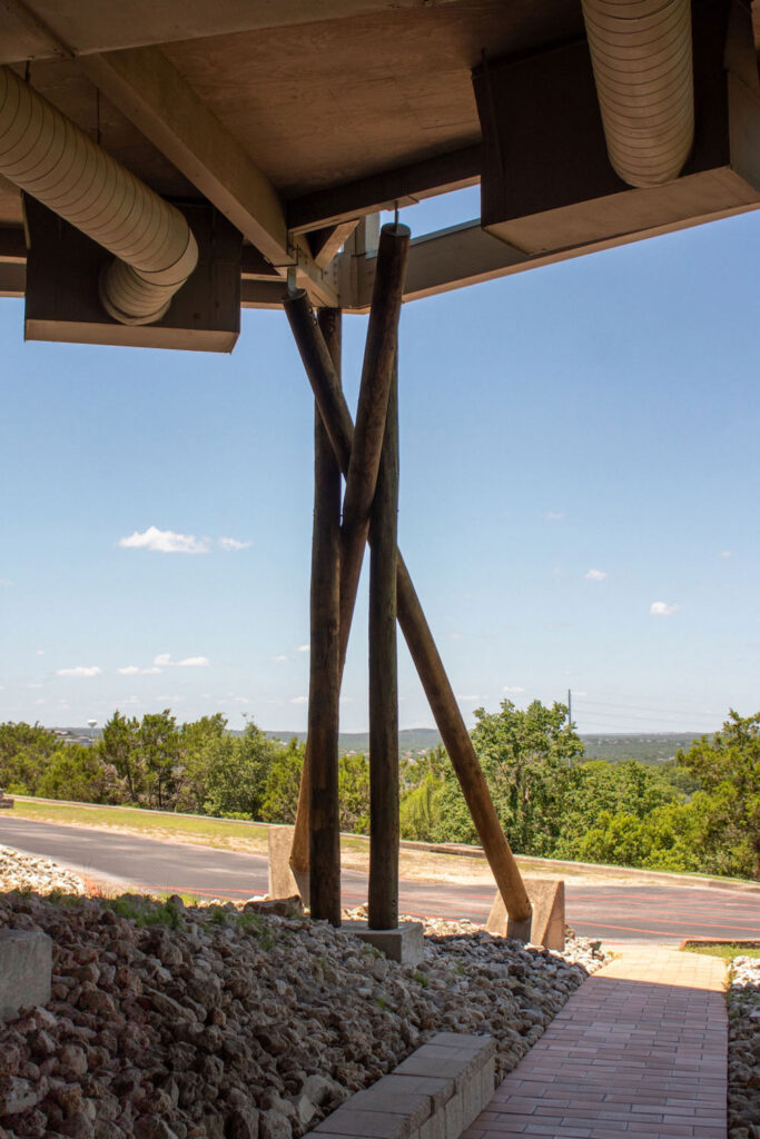 Perched atop a hill along Bee Caves Road, the Church of the Conscious Harmony is a little-known, yet almost monumental, building located southwest of Austin. Many have remarked on its striking appearance; the large, round sanctuary seemingly defies gravity atop its forest of timber supports. This arrangement evokes a perception of precariousness, as if the building could be blown over by a strong wind, yet simultaneously demonstrates significant structural ingenuity. What is visible from the road, however, represents only a fraction of this unique place, as a rich complex lies discreetly hidden among the trees beyond.