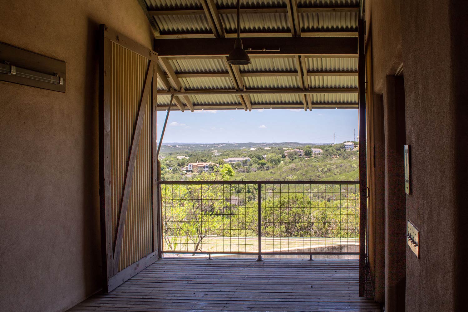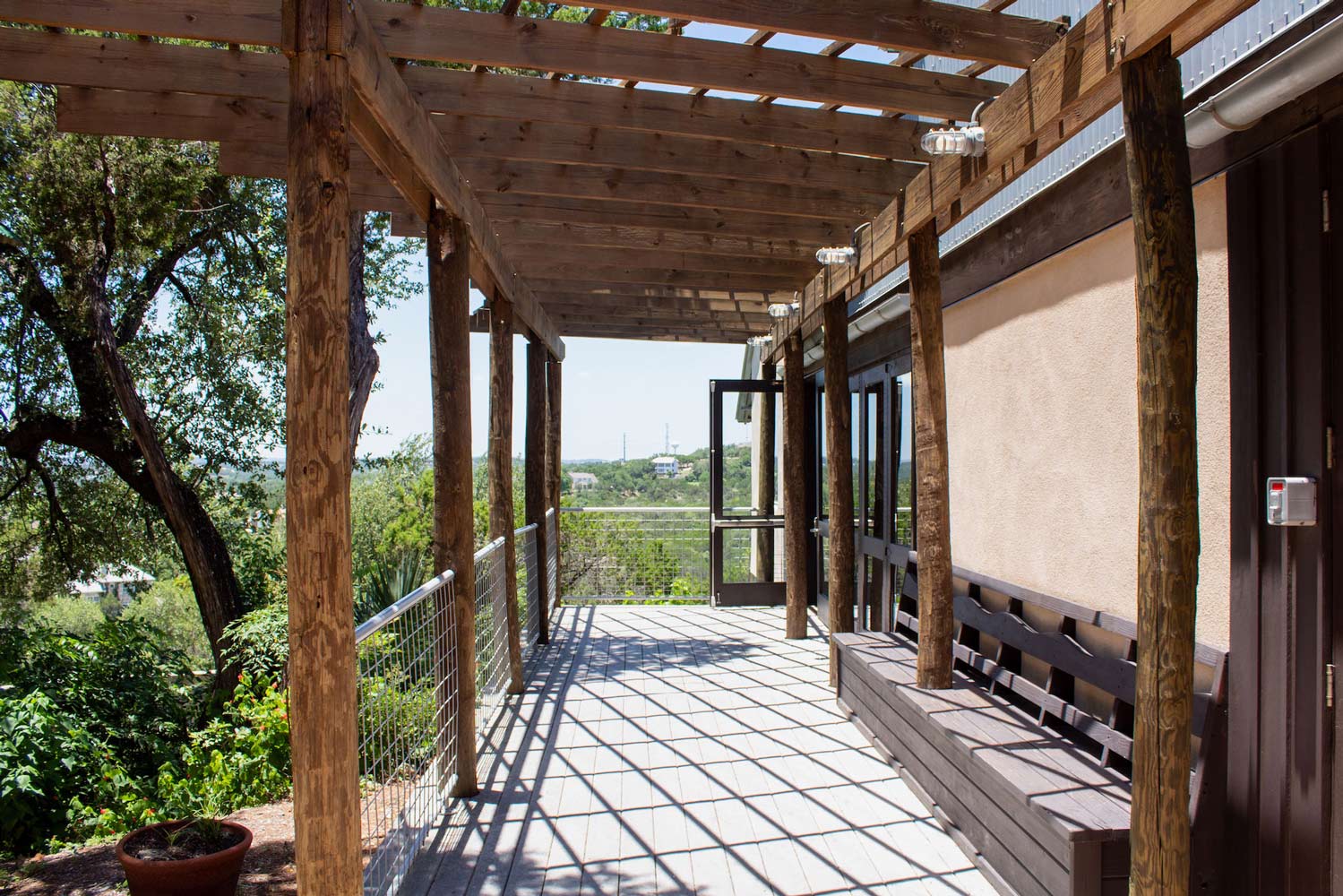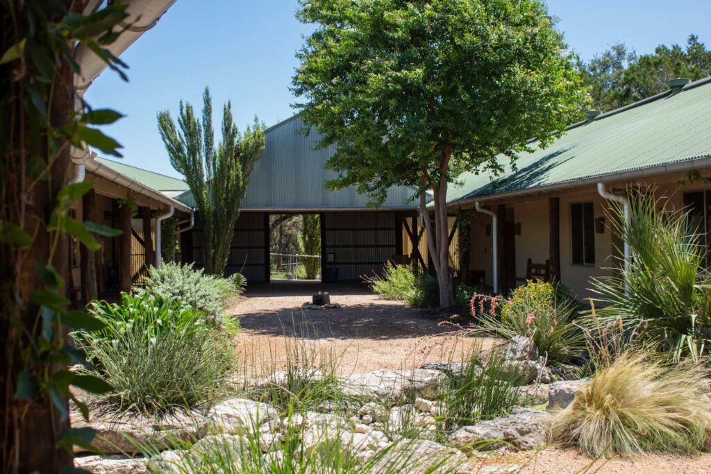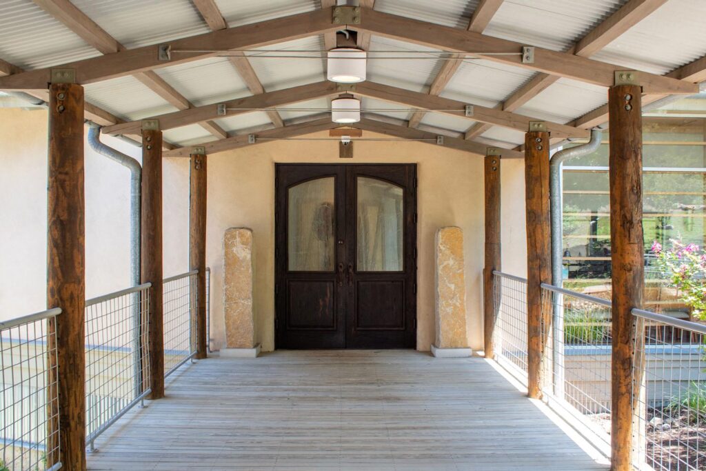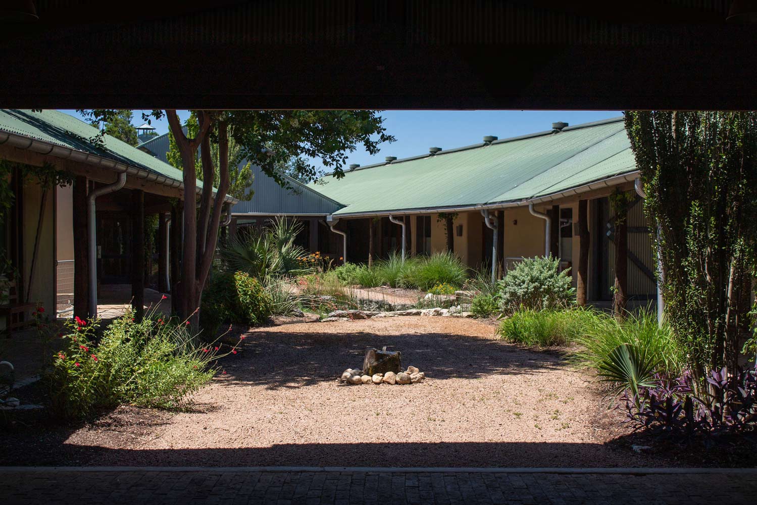 Turning a corner, one finally steps “inside” the walled garden courtyard. This tranquil space is encircled by small classrooms, each featuring large windows that open to both the landscape and the courtyard itself. Every few classrooms, a gap in the façade forms a small niche with massive doors that open directly to the outdoors, creating ideal conditions for cross-ventilation within the courtyard. A continuous covered walkway, reminiscent of a cloister in a classical monastery, connects the classrooms and encircles the courtyard. This area exudes a quiet, contemplative atmosphere. The usual noise from Bee Caves Road disappears, replaced by a gentle breeze. While it can become lively between Sunday school classes or group yoga in the community room, the courtyard quickly returns to its quiet existence. At either end of the courtyard, two community spaces—one indoors and one outdoors—punctuate the rows of identical classrooms.