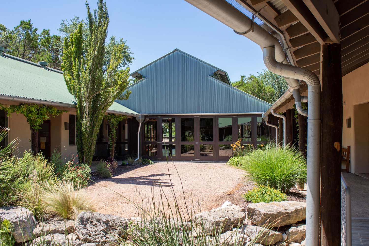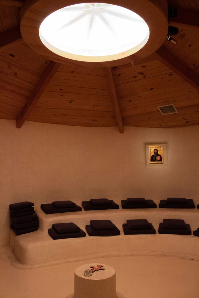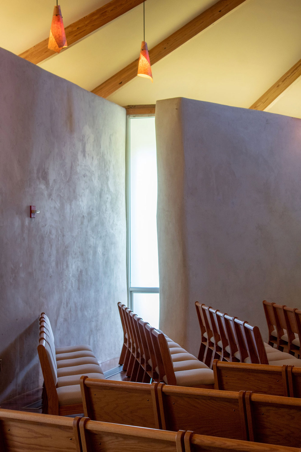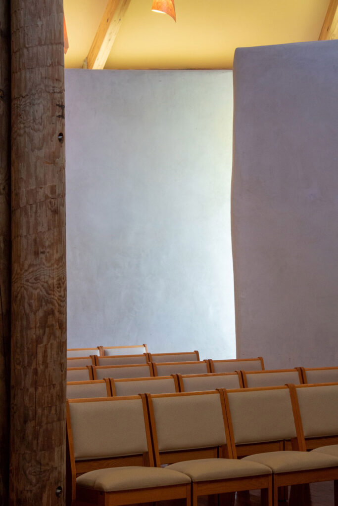 From the road, the sanctuary appears to be the church’s primary space, but it actually takes on a secondary role in the overall complex. From the gravel parking lot scattered with native trees, entry begins by descending a flight of stairs marked by a sign proclaiming, “All who enter are welcome.” The path then narrows—squeezing visitors between offices on the left and the high wall of a courtyard on the right—before opening back up suddenly to reveal an expansive, panoramic view of the surrounding landscape.