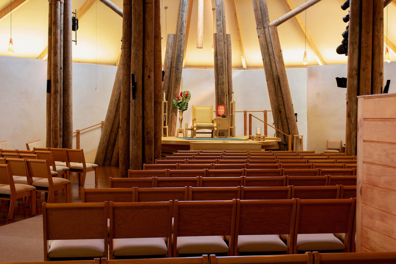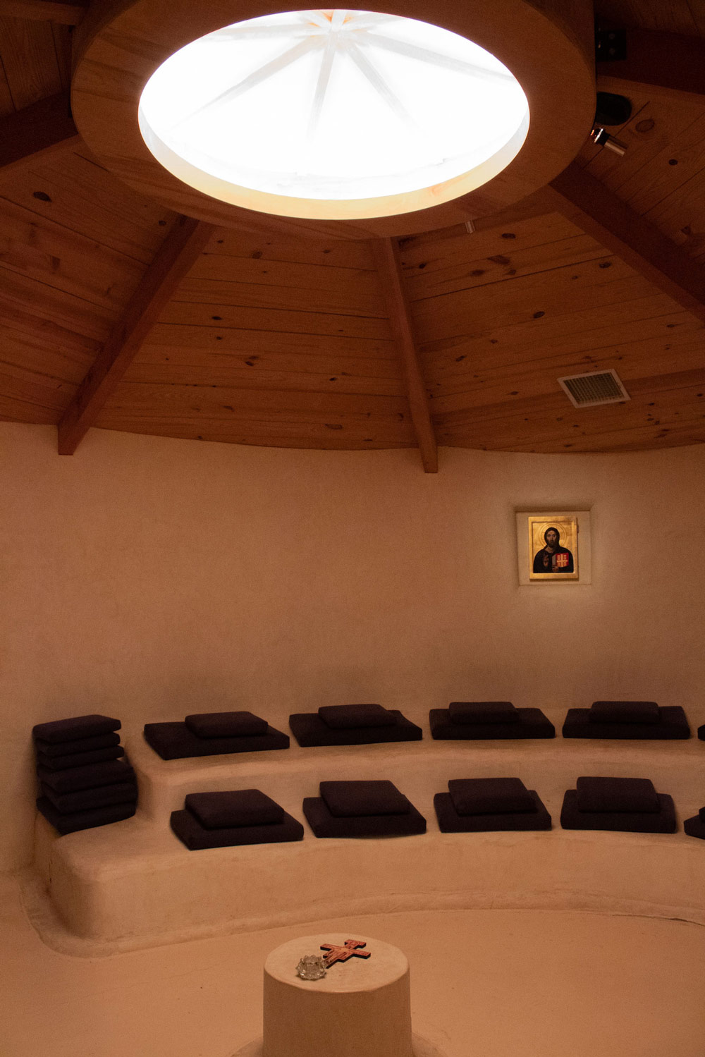 The congregation played a central role in both the design and construction of the church. Each member was encouraged to participate, both to challenge themselves with unfamiliar tasks and to instill a deeper meaning into the space created by their own labor. One congregant recounted a story about laying brick pavers in the outdoor meeting area without prior masonry experience. After completing the task, they discovered waves in the brick where some had settled, and decided that the work had to be torn up and replaced (twice!). This painstaking dedication reveals a truth about the church itself: it is not a materially rich place—there is no marble, ornate paintings, or extensive decoration. But the intention and care invested in the space are equally, if not more, powerful. – James Mustillo, AIA