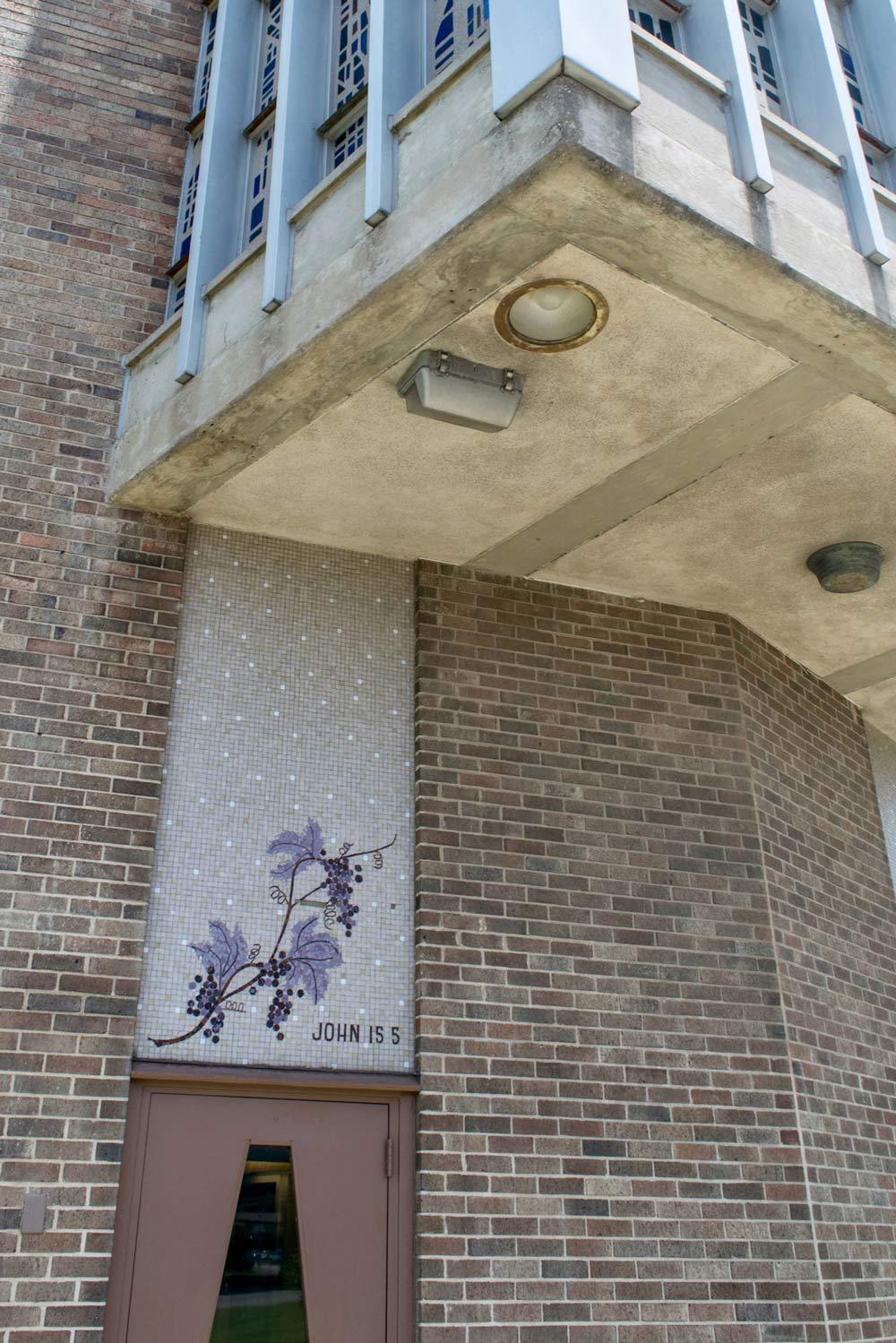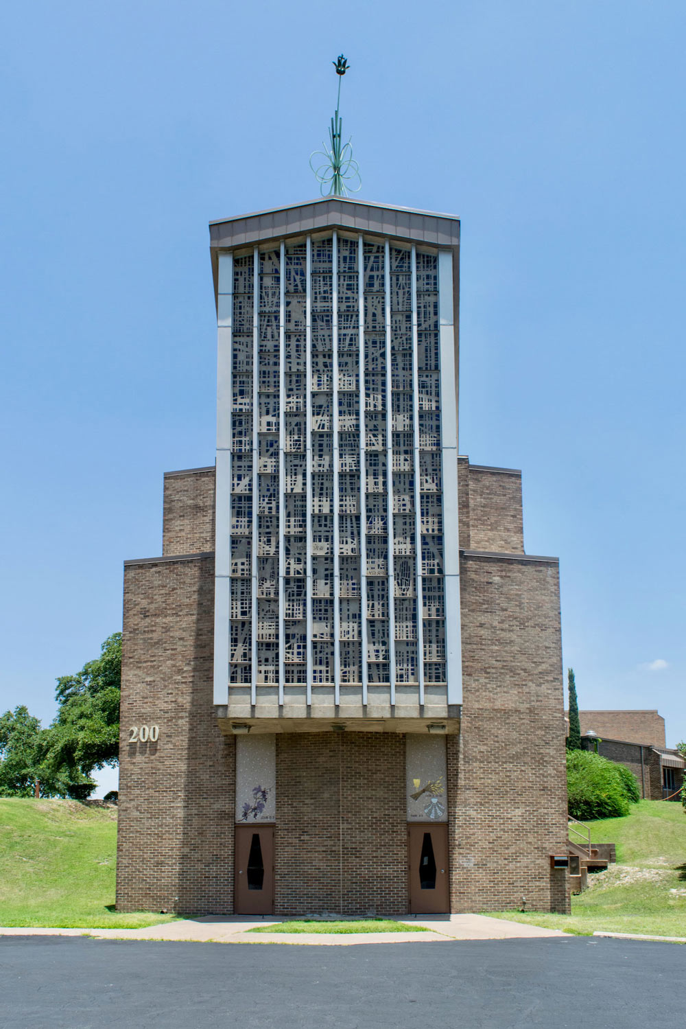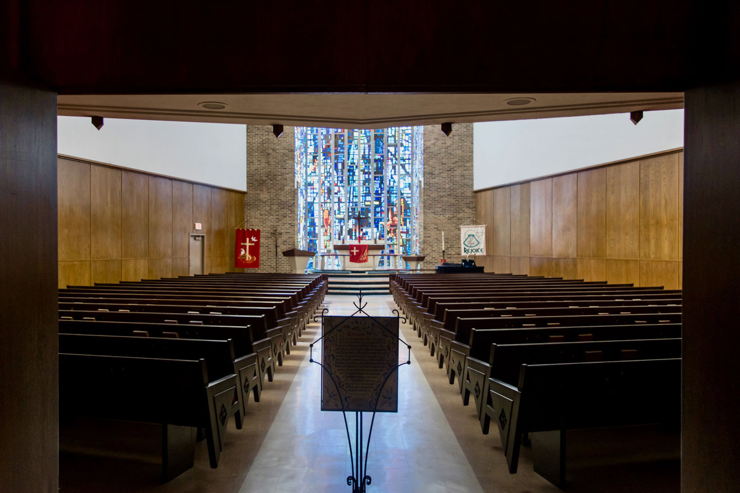 Although Wukasch designed a complete master plan for the church complex, the sanctuary was the only portion of his design that was constructed. The 1979 brick addition was not included in Wukasch’s plan, but its downhill position allows the sanctuary to retain prominence on the site. The stained-glass chancery and clerestory windows were installed in 1987 and 1991, respectively, under Loire’s guidance and in accordance with the plans Wukasch laid out. Along the west wall, one glass panel incorporates the letter “A” to represent Austin. Wukasch’s own funeral was held at Gethsemane Lutheran Church on November 5, 2001—a testament to his commitment and love for this building. – Abigail Thomas