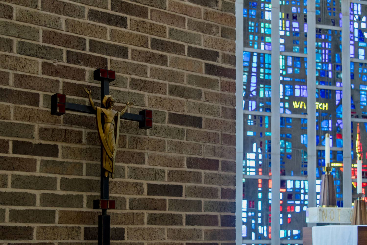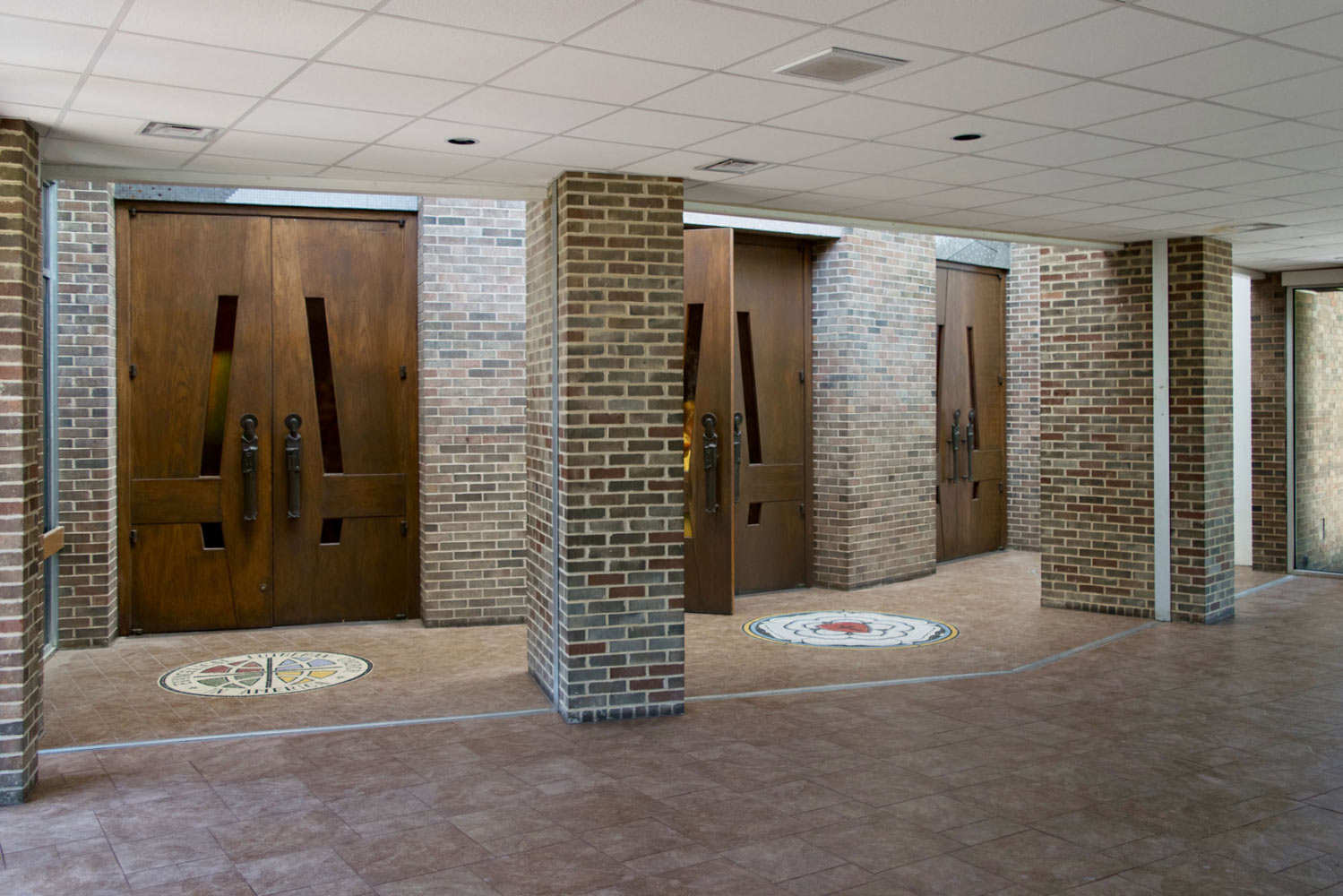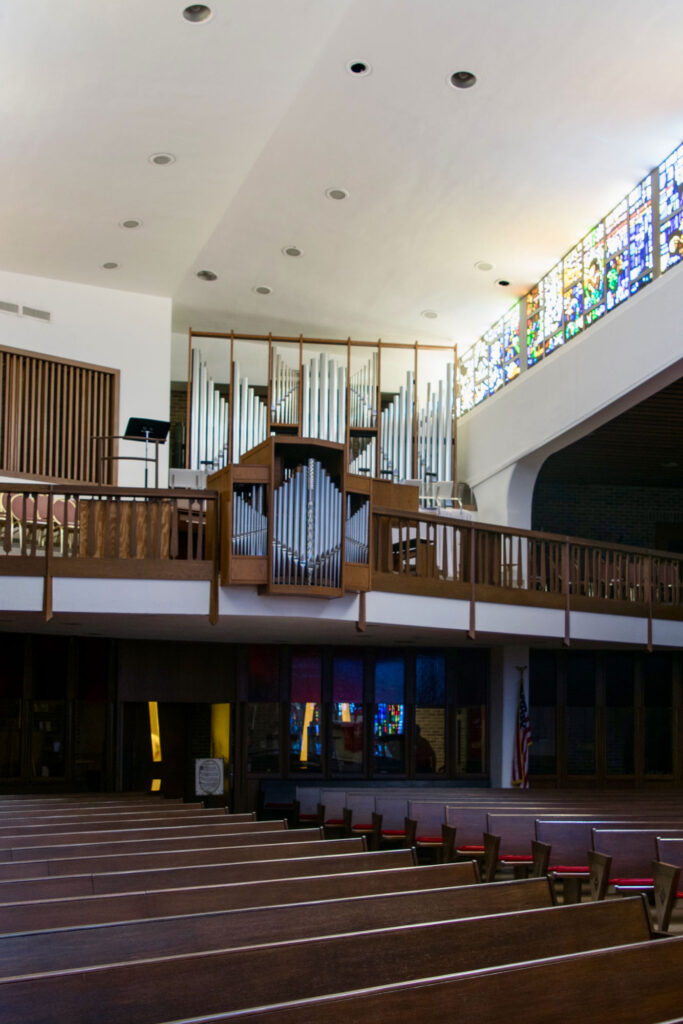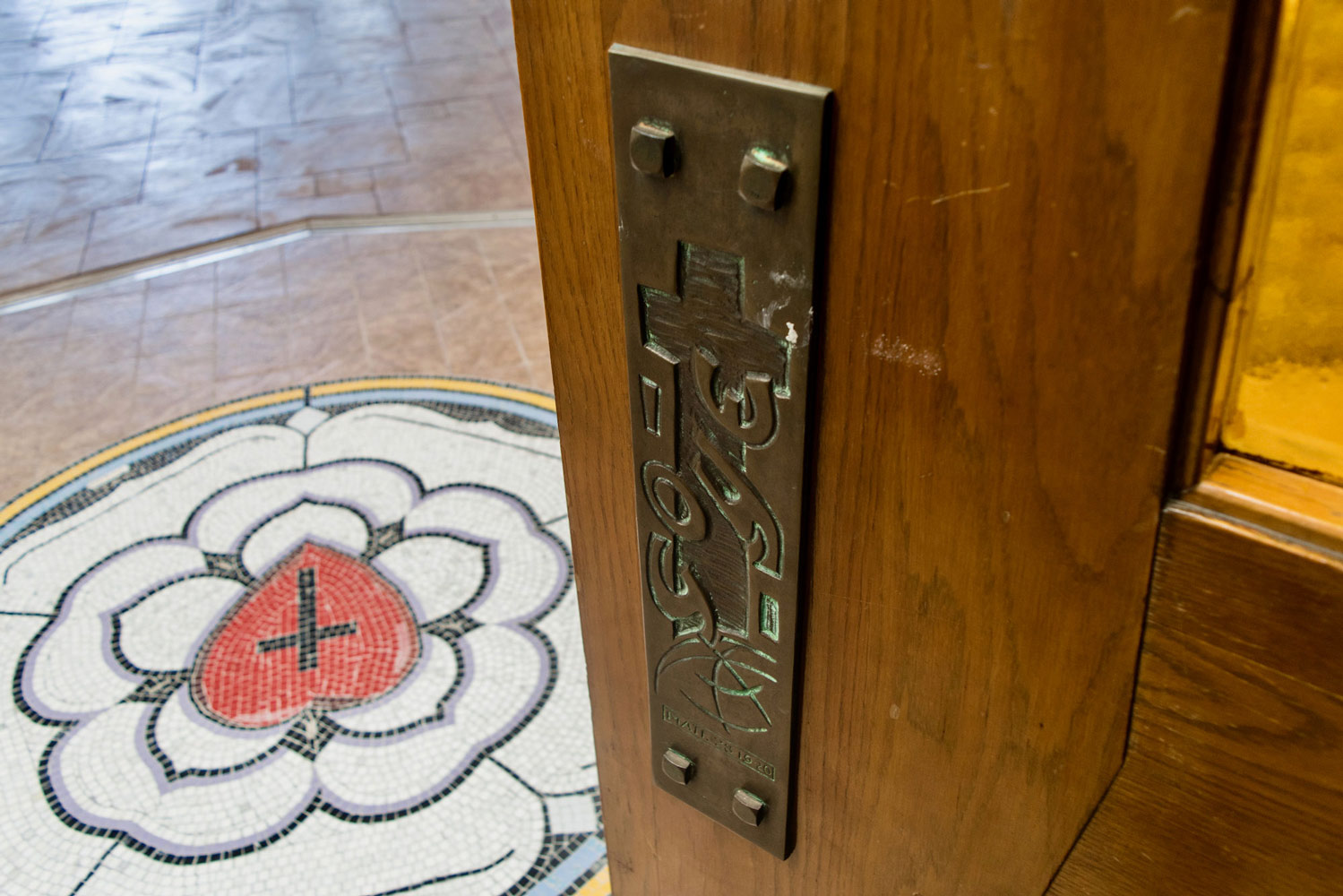 Although Wukasch designed a complete master plan for the church complex, the sanctuary was the only portion of his design that was constructed. The 1979 brick addition was not included in Wukasch’s plan, but its downhill position allows the sanctuary to retain prominence on the site. The stained-glass chancery and clerestory windows were installed in 1987 and 1991, respectively, under Loire’s guidance and in accordance with the plans Wukasch laid out. Along the west wall, one glass panel incorporates the letter “A” to represent Austin. Wukasch’s own funeral was held at Gethsemane Lutheran Church on November 5, 2001—a testament to his commitment and love for this building. – Abigail Thomas