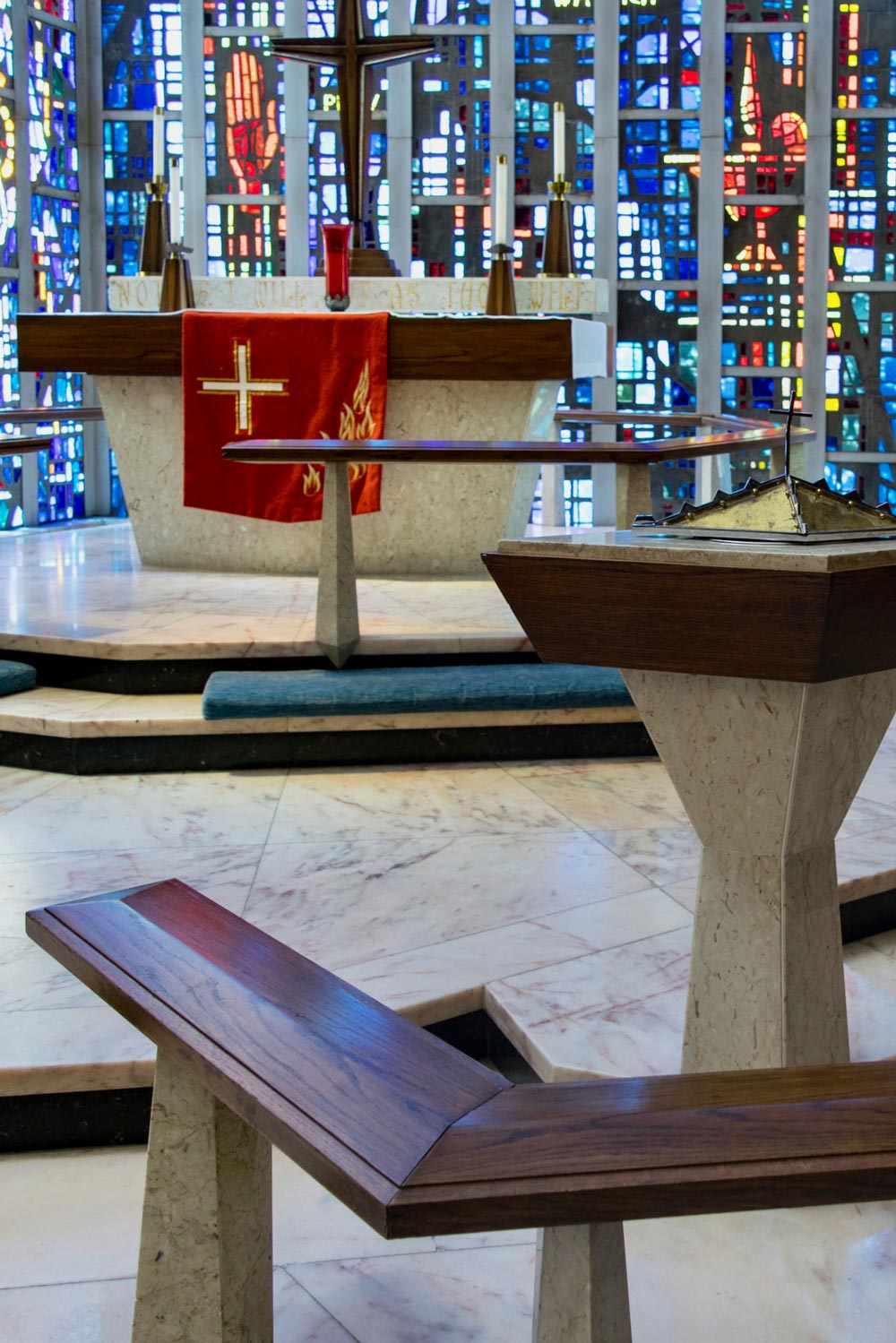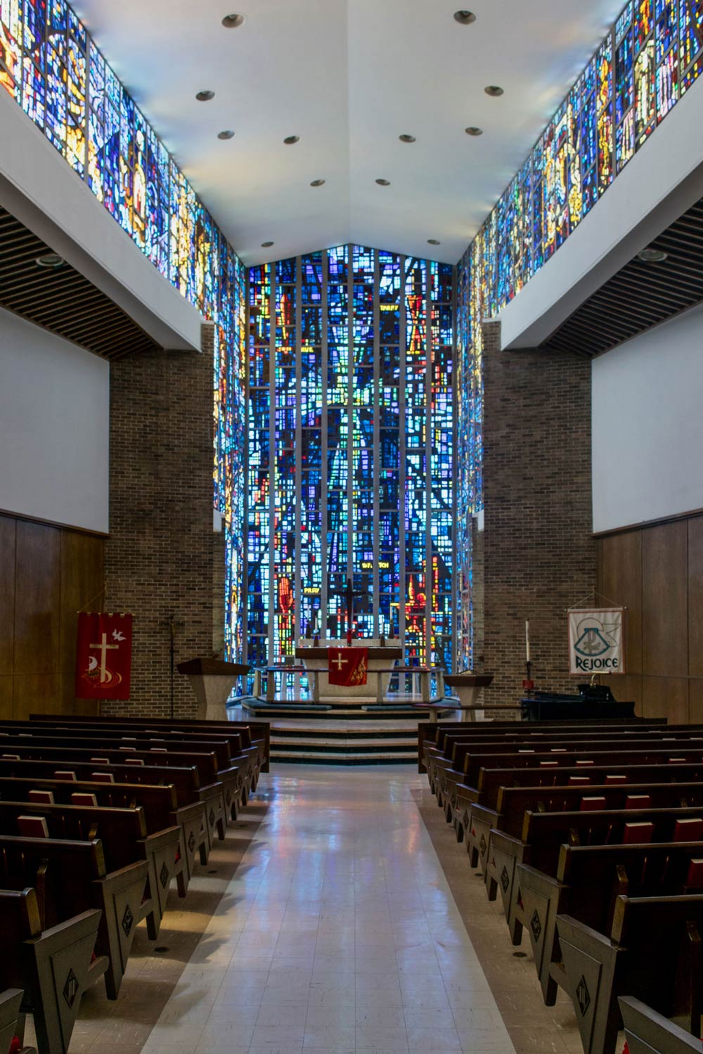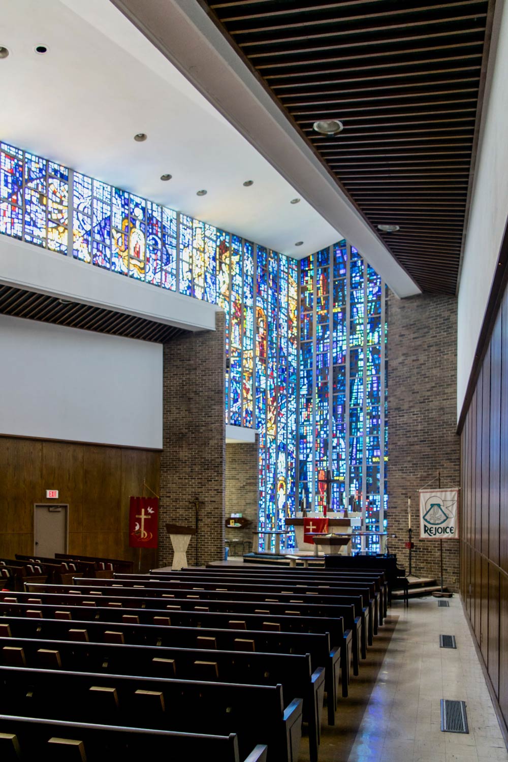 The church is most notable for its 36-foot-tall stained-glass centerpiece created by the famed French artist Gabriel Loire. Based on sketches done by Wukasch’s wife, Doris, the window was constructed in the dalle de verre style that Loire helped pioneer. This unique type of window is composed of roughly-shaped glass pieces inserted into steel-reinforced concrete, allowing the artwork to perform a structural function as well as an aesthetic one. Wukasch envisioned the church as a ‘lantern held by God,’ choosing to include no ornamentation within the sanctuary save for the multicolored light filtering in through the faceted stained glass.