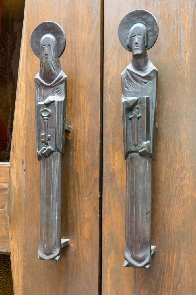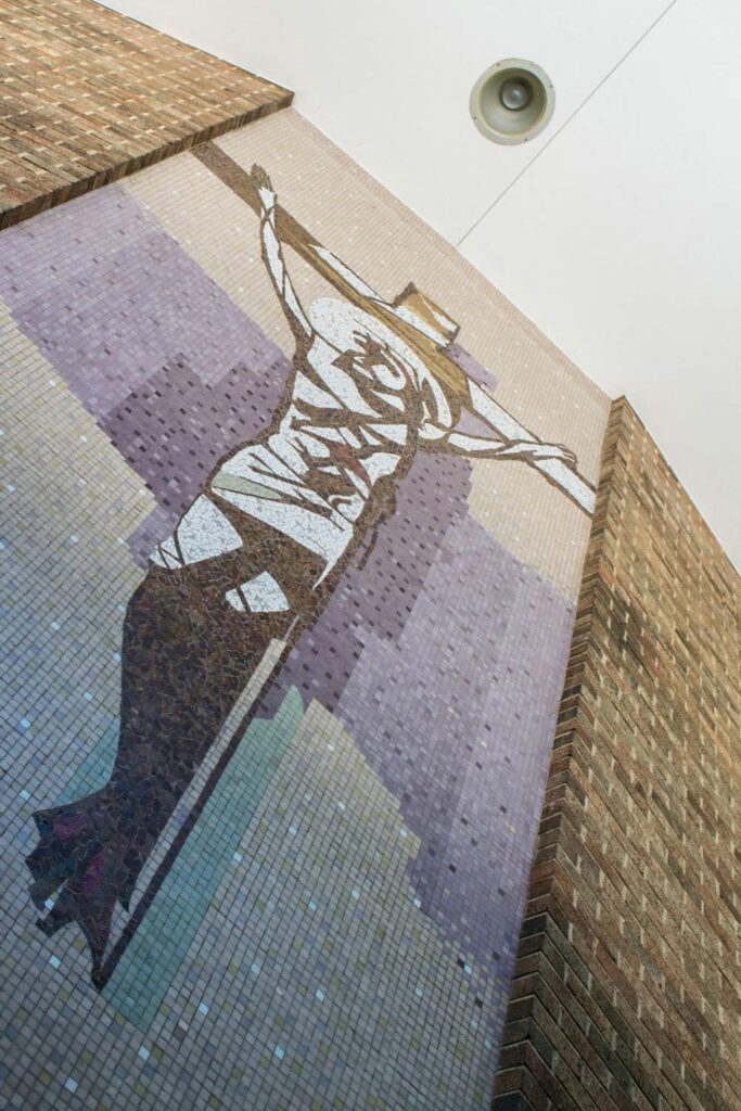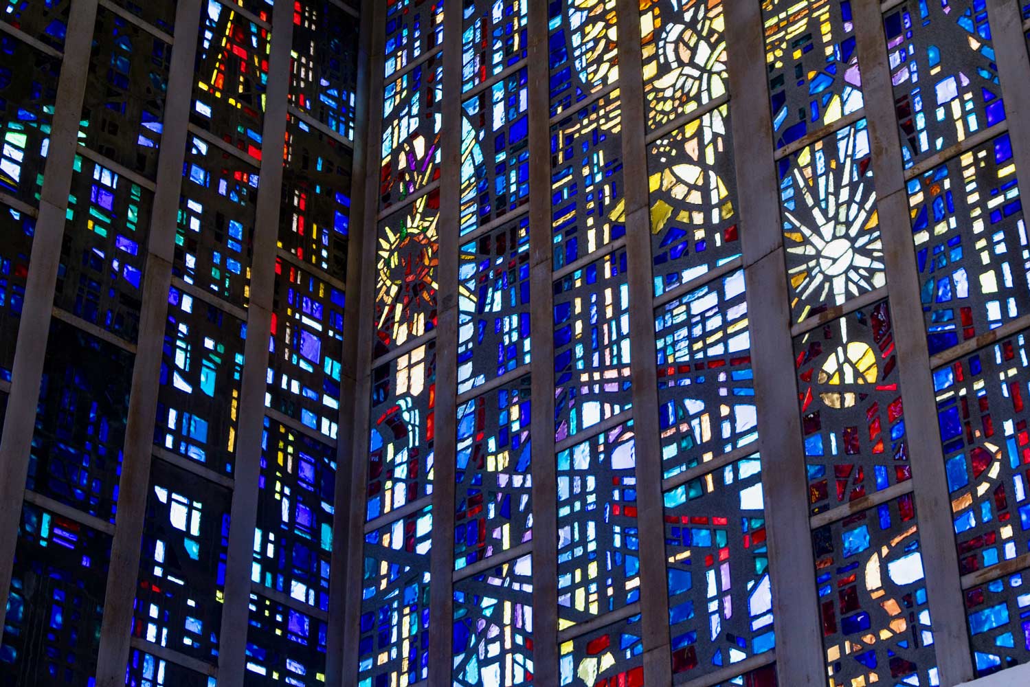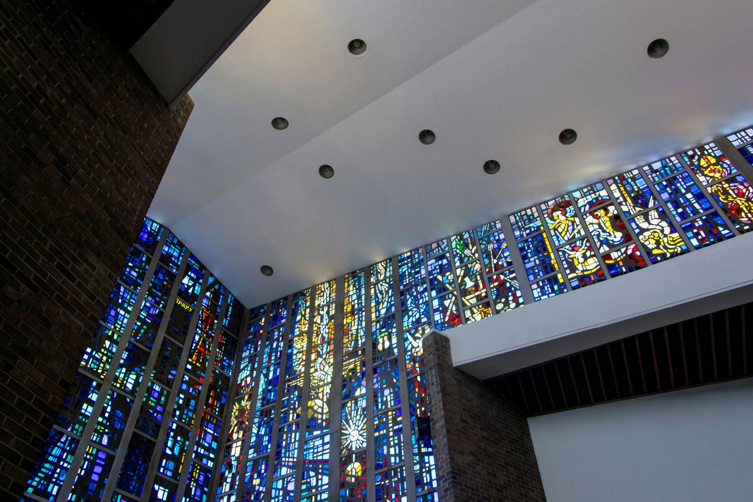The church is most notable for its 36-foot-tall stained-glass centerpiece created by the famed French artist Gabriel Loire. Based on sketches done by Wukasch’s wife, Doris, the window was constructed in the dalle de verre style that Loire helped pioneer. This unique type of window is composed of roughly-shaped glass pieces inserted into steel-reinforced concrete, allowing the artwork to perform a structural function as well as an aesthetic one. Wukasch envisioned the church as a ‘lantern held by God,’ choosing to include no ornamentation within the sanctuary save for the multicolored light filtering in through the faceted stained glass.
